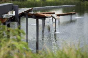 Turpin Crawford Studio’s work with water exemplifies their deep engagement with the dynamic energies of nature and their commitment to revealing the interconnectedness of ecological, environmental and human systems. Over the past three decades, they have created kinetic installations that respond to the ever-changing energies of water, transforming public spaces into living systems that reflect cycles of movement, flow, and transformation. These works—situated between art and environment—often emerge from interdisciplinary collaborations with scientists, engineers, and communities, and are embedded in broader ecological and urban rehabilitation efforts.