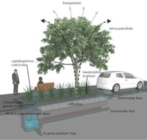 The Perth City Link (PCL) project aims to reconnect Perth’s city centre with Northbridge, integrating water-sensitive stormwater management solutions. Raingardens integrated with street parking provide retention, filtration, and bio-remediation, enhancing biodiversity and urban aesthetics.