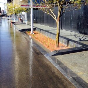 Key features include appropriate raingarden design, intercepting first flush events, and integrating with existing drainage systems. Safety measures, like trafficable ramps and stone kerbs, ensure public safety. The project promotes connectivity, providing functional and high-amenity spaces, aligning with the City of Perth’s standards. Custom seating integrated with raingardens enhances practicality and aesthetics. Reduced kerb heights and flush parking bays create a sense of spatial generosity and promote pedestrian-friendly environments.