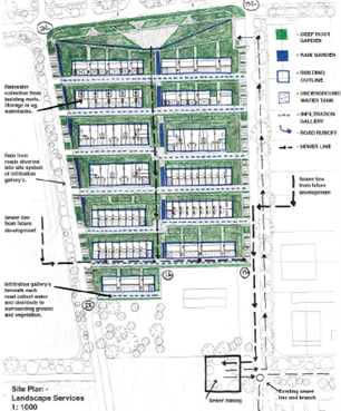 WSUD Solution: Greywater reuse, Pervious paving, Rainwater storage