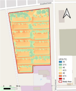 Water sensitive development integrates water management into urban design, enhancing sustainability and liveability. A heat assessment was conducted on the Knutsford development. Using models like SOLWEIG, thermal comfort was assessed via Universal Thermal Climate Index (UTCI). Results indicate all scenarios experience high heat stress, with increased imperviousness exacerbating heat in BAU.