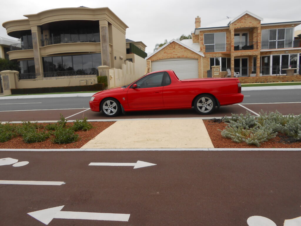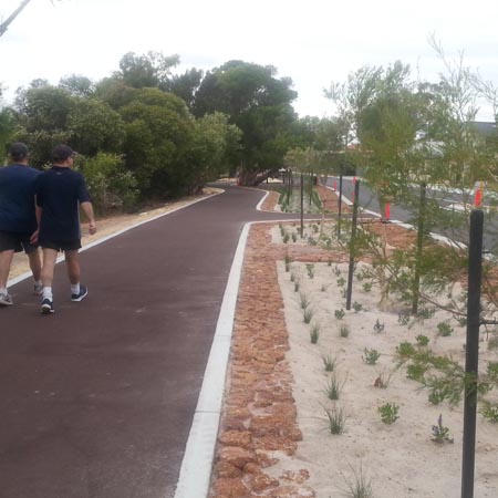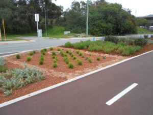 Completed in November 2016, the project incorporated biofilter garden beds filled with native soil and TerraCottem©, strategically placed between the road and pedestrian footpaths to treat and infiltrate stormwater. Additionally, limestone paths were integrated to ensure safe pedestrian access without disturbing vegetation, while laterite spalls prevented erosion and created visually appealing water paths. The road’s grading directs runoff towards the biofilter beds, enhancing water retention and filtration.
