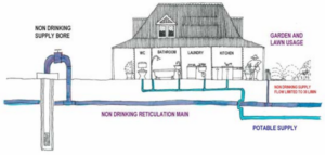 The development has installed a reticulated non-drinking water or dual reticulation system which delivers non-drinking water supply for the irrigation of public open spaces and private spaces using groundwater from the superficial aquifer. An onsite weather station with moisture sensors is connected to five bores and has a central controller which determines the watering schedule.