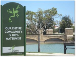 'The Green' development in Wanneroo incorporates a non-drinking water system for irrigation, weather-controlled watering, and community support. Data suggests significant household water reduction compared to Perth average.