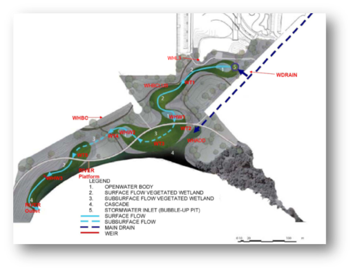 WSUD Solution: Constructed wetlands, Non structural strategies - maintenance, education and participation programs, Retain native vegetation and natural landform, Waterwise landscaping